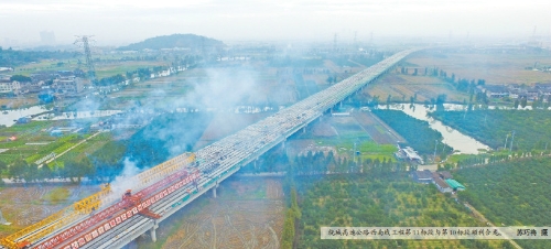 11月21日上午,位于平阳万全的温州绕城高速公路西南线工程第11标段横塘大桥最后一片梁板架设完毕,与第10标段顺利合龙,成为全线率先完成主体工程施工的标段,这意味着该标段正式进入土建收尾施工阶段。