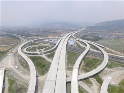 昨天,记者来到绕西南工程第10标段的万全枢纽。通过无人机从高空往下看,万全枢纽像是巨大的“圆盘”,横跨甬台温高速复线,与其形成交叉。