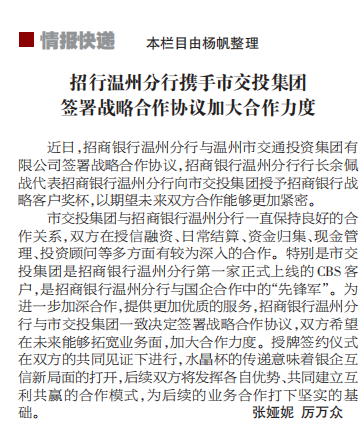 招行温州分行携手市交投集团签署战略合作协议加大合作力度