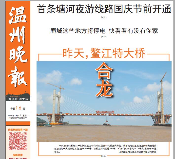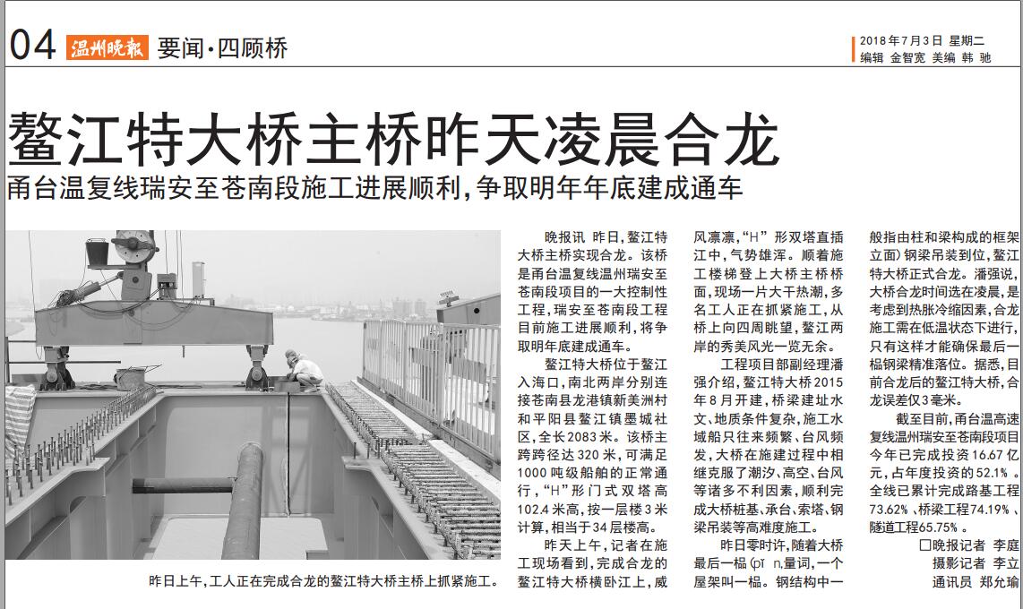 昨天,鳌江特大桥合龙