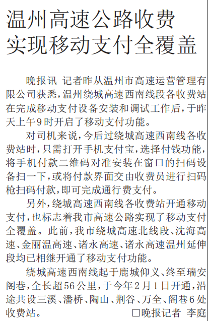 温州高速公路收费实现移动支付全覆盖