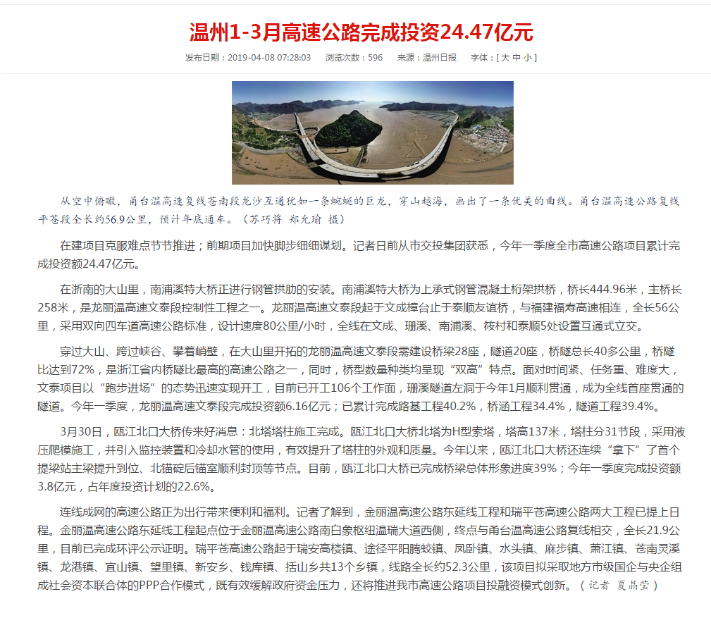 温州1-3月高速公路完成投资24.47亿元