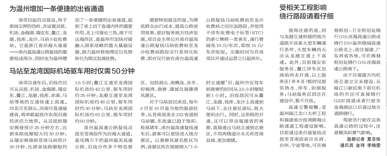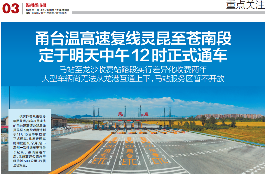甬台温高速公路复线灵昆至苍南段定于明天中午12点正式通车