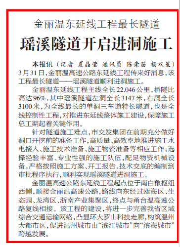金丽温高速东延线工程最长隧道——瑶溪隧道开启进洞施工