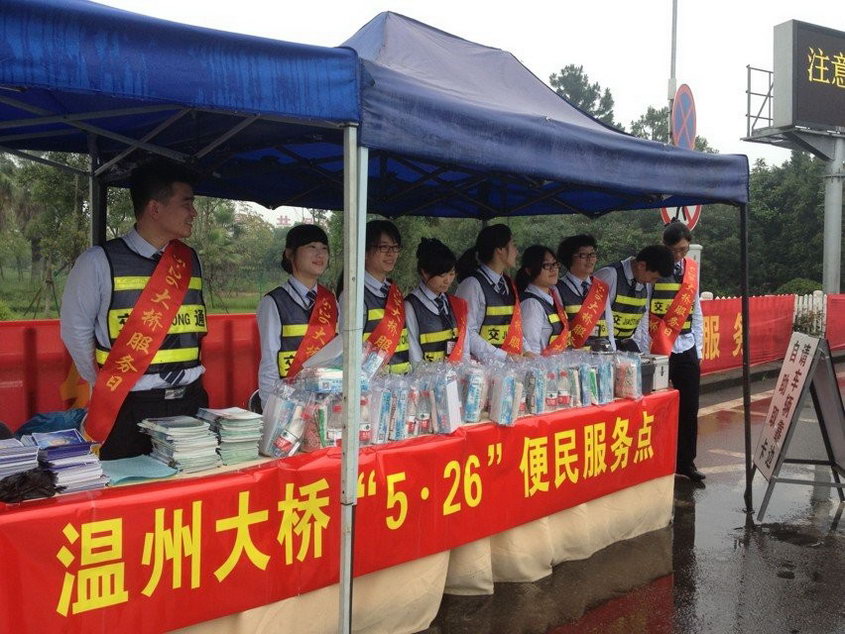 今年5月26日是温州大桥建成通车16周年纪念日,大桥管理处组织青年职工志愿者在温州东收费广场开展“5.26大桥服务日”活动。