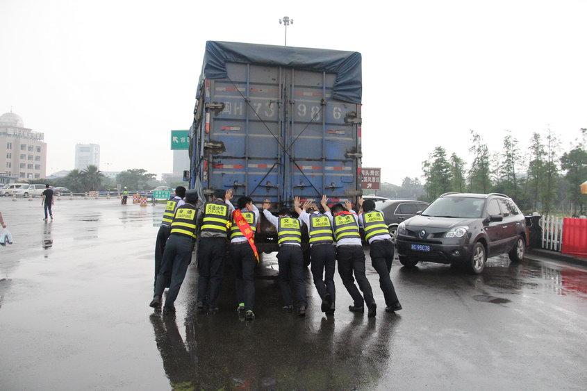 活动开展过程中还出现了一个小插曲——一辆货车在驶出温州东收费站出口时因为抛锚停在了广场中央,给过往车辆带来了一定的安全隐患。若等待交警过来拖车最快也要半小时,为第一时间将抛锚车辆牵引至安全地带,消除安全隐患,现场的青年志愿者们合力徒手将抛锚货车推到了临时停车点,确保了广场车辆安全畅通。