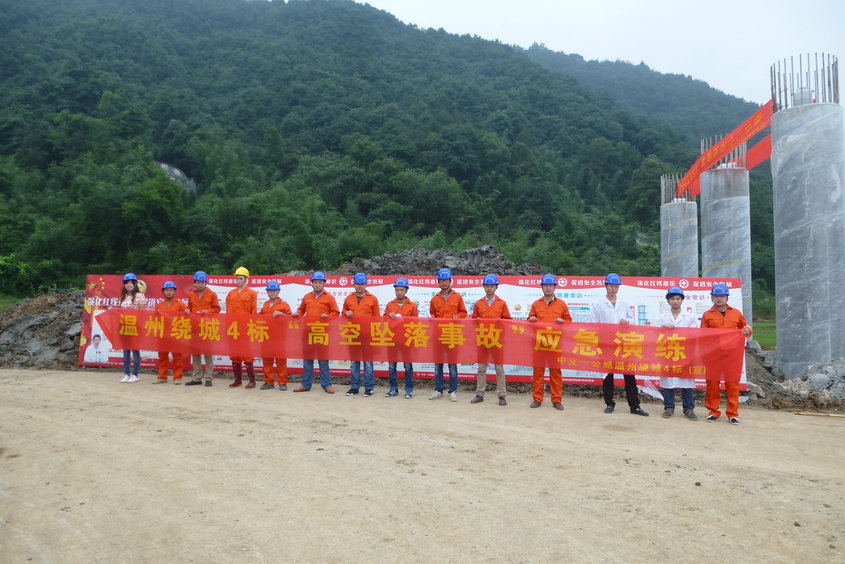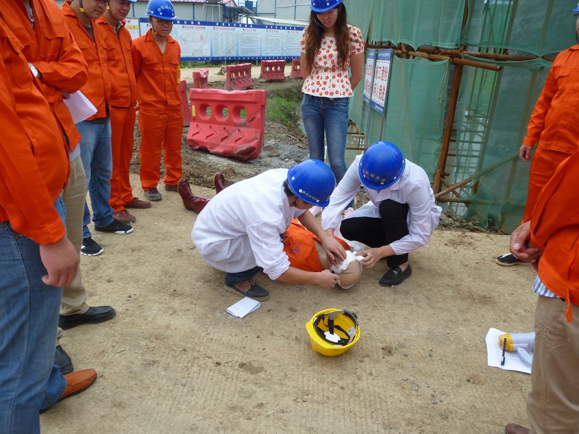 项目部对应急演练进行了精心的策划和部署。演练开始后,模拟墩柱脚手架上五名工人正在搭设临边防护设施,一名工人从高空坠落,头部受伤流血,昏迷不醒,情况危急,项目部立即启动应急预案并迅速展开救援活动,工人自救、应急救援小组疏散员工、医疗救护小组救治伤员、综合协调小组呼救120等。整个演练过程中,6个小组分工协作,进展有序。通过此次活动,有效检验了项目部应急体系的运行,提高了全体职工的事故应急处理能力,同时对提升安全生产管理工作有着极大的促进作用。