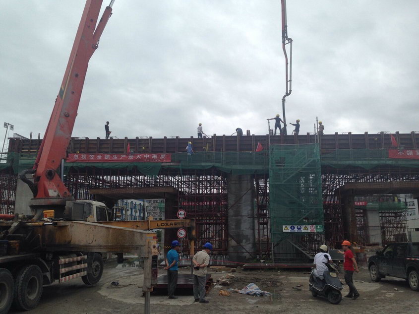 本次浇筑盖梁为瞿溪互通主线8#墩位中桩处预应力盖梁,浇筑方量224方,门式墩盖梁采用钢管桩支架法施工,以定制钢模为模板。为确保首件预应力盖梁质量,第3标段认真核对设计图纸及设计文件,提前对施工班组进行技术交底,对机械设备进行检查,并做好原材料检验,确保首件质量万无一失。同时,监理对每一步施工工艺进行严格控制,特别对钢筋绑扎及保护层垫块进行严格检查,确保保护层厚度满足设计及规范要求。由于本次施工点地处金州工业区重要交通路段,车流量大,第3标段安排专人进行交通疏导,确保过往车辆和行人的安全。