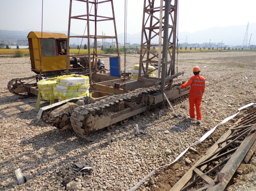K36+063.5~K36+223.5段路基为第8标段第一段路基工程,处理长度170m,路基宽度33.5m,设计高度4.1m,连接飞云江大桥和灯垟大桥。软基处理施工工艺采用塑排板+超载预压+泡沫砼。塑排板采用可测深式,深度为30m,通过塑排板中铜丝进行深度测量,塑排板中的芯板采用新料以保证排水效果。塑排板布置间距为120cm,平面以正三角形布置,总根数为6532根,总长195960m。超载预压期为15个月,自下而上布置为沙砾垫层、复合土工布、土工格栅、宕渣路基、预压填土,沙砾垫层总厚度50cm,分两层铺设。