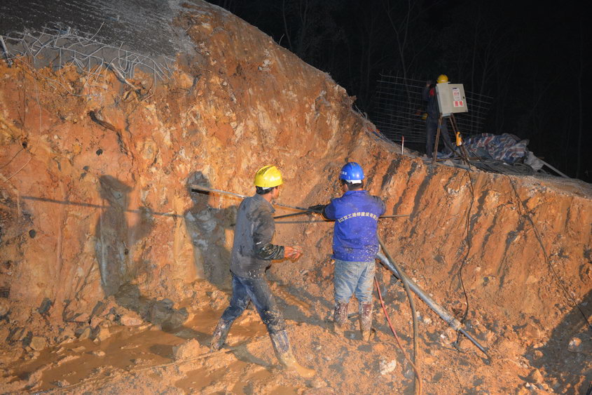 连日来,绕西南项目第5标段太平山2#隧道右线洞口晚上灯火通明,气腿式凿岩机钻孔发出熟悉地铿锵声,施工人员克服夜间天气冷、洞口场地狭小等诸多困难,加班加点进行边仰坡防护。打钻,初喷,注浆,安设锚杆......一道道工序有条不紊地进行。