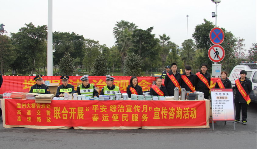2月4日,春运大幕正式拉开,温州大桥管理处联合高速交警、高速路政在温州东收费站开展了“平安综治宣传月 春运便民服务”为主题的宣传咨询活动。