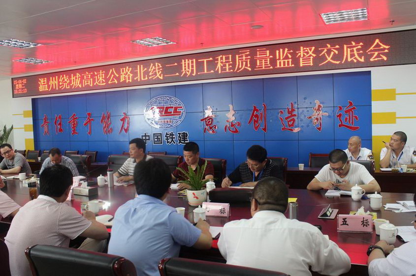 6月2日,温州市交通工程质量监督局在绕北二期项目第2标段会议室召开温州绕城高速公路北线二期工程质量监督交底会,绕北二期管理处、监理办及各土建施工单位共计65人参加会议。