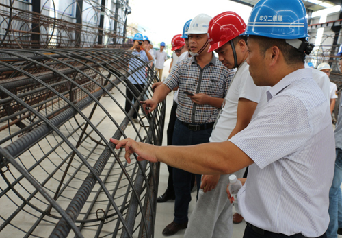 一行人严格检查了3标项目部钢筋场的工作成果,仔细观察了工人切割钢筋的过程,对钢筋连接、绑扎技术、工人的切割工艺以及施工环境提出了表扬,同时对钢筋厂工作的进一步开展提出了指导意见。3标项目部经理霍胜、总工刘胤对检查小组提出的疑问一一进行了解答,并认真听取了各方建议。