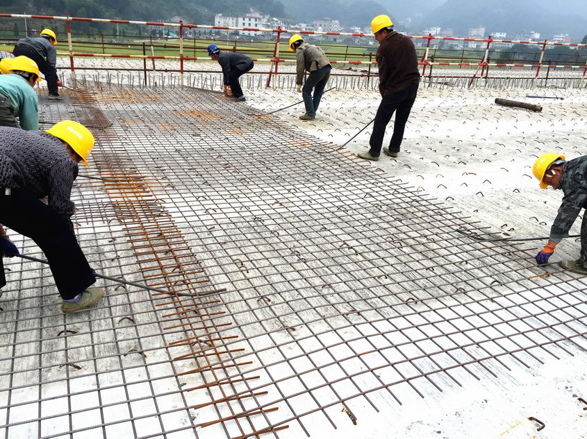 桥面施工主要分为桥面清理、测量放样、钢筋网加工安装、混凝土施工和洒水养生等步骤。其中,桥面清理遵照一“凿”二“扫”三“吹”四“冲洗”原则,采用凿毛机与人工凿毛锤相配合的方法进行。整体拉网式向前推进,彻底清理桥面上的浮浆、浮碴、杂物。桥面铺装钢筋网片的固定和安装采用桥面红油漆点位的方法,用冲击钻钻孔,梅花形加密布置,随后将钢筋头楔入其中,并在网格下降