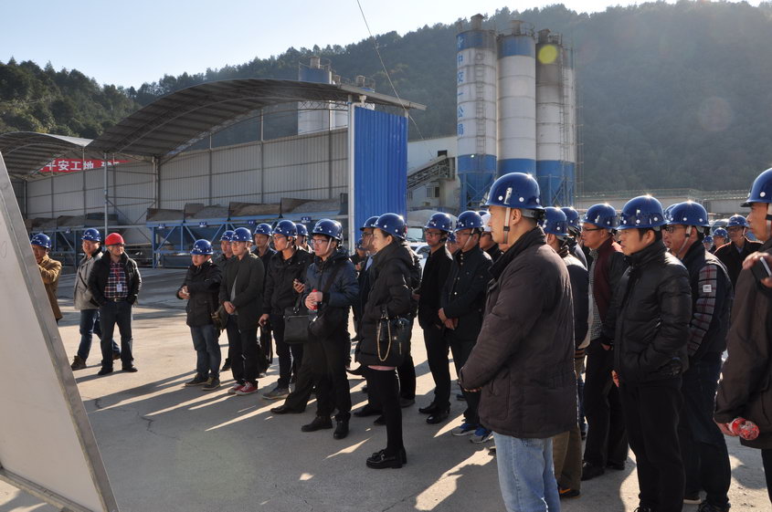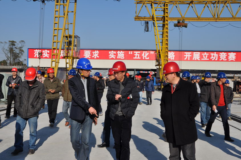 一行人先后来到项目试验室、拌合站、钢筋加工场和梁场进行了实地参观。项目经理杜峰结合具体施工情况,从质量安全标准化方面进行了详细介绍,并针对混凝土构件保护层控制、T梁预应力施工、混凝土构件喷淋养护以及智能、数控设备使用等施工工艺进行细致展示。