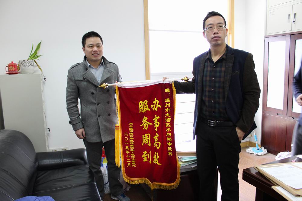 12月23日,沈海公司党支部书记、副总经理、温瑞处处长蔡邦国率队赴温州市龙湾区水利局审批科赠送“办事高效、服务周到”的锦旗,代表甬台温高速公路复线温瑞段工程建设管理处对龙湾区水利局审批科高效的办事效率、为民服务的良好作风表示深深的谢意。