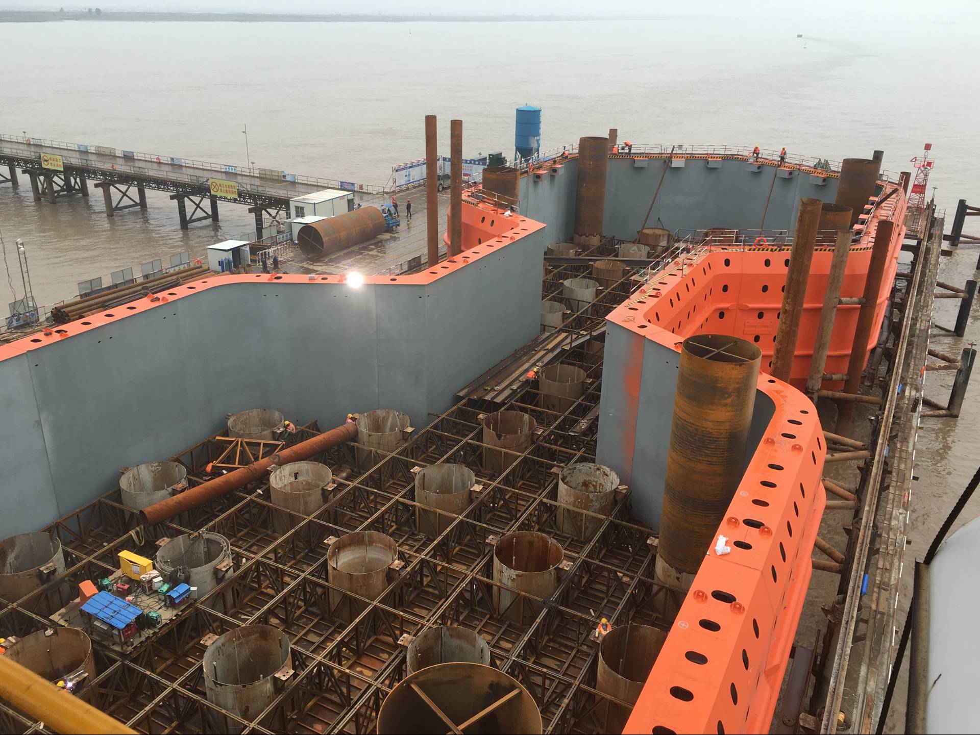 甬台温复线飞云江跨海特大桥首个主墩防撞钢套箱拼装工作告捷