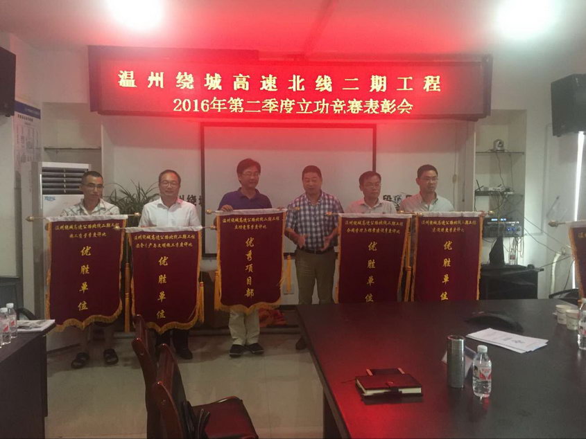 2016年是绕北二期项目的开工年,为推进工程建设,提高工程管理水平,绕北二期工程在交投集团的统一领导下,以劳动立功竞赛活动为抓手,积极开展“比亮点,树标杆”活动。在第二季度的施工建设中,各参建单位卯足干劲、力争上游,认真履行合同约定,精心组织,严格管理,圆满的完成各项建设任务,工程建设取得了阶段性成果。绕北处高度重视、统一认识、积极行动,安排相关负责人对5个标段进行现场检查打分,综合评选出优秀项目部、优秀施工班组、先进个人等奖项。李革为优秀项目部(浙江天宇交通建设集团有限公司),优秀项目经理江大根(中铁十六局三公司)、优秀总工刘斌(浙江天宇交通建设集团有限公司)等获奖集体及个人颁奖。