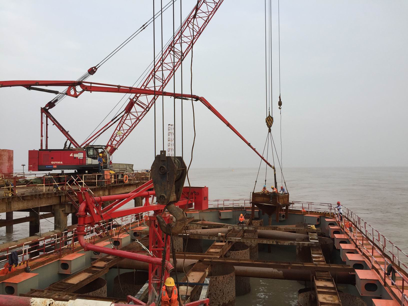 为保证防撞钢套箱施工顺利完成,项目部组织方案专题讨论,实行领导现场带班制度,严格把控套箱安装、起吊,封底等各个环节,有序落实系列保护措施,成功抢在高潮位来临前完成了封底混凝土浇筑,大大减小了潮汐对施工的不利影响,为下步承台和墩柱施工打下了坚实的基础。