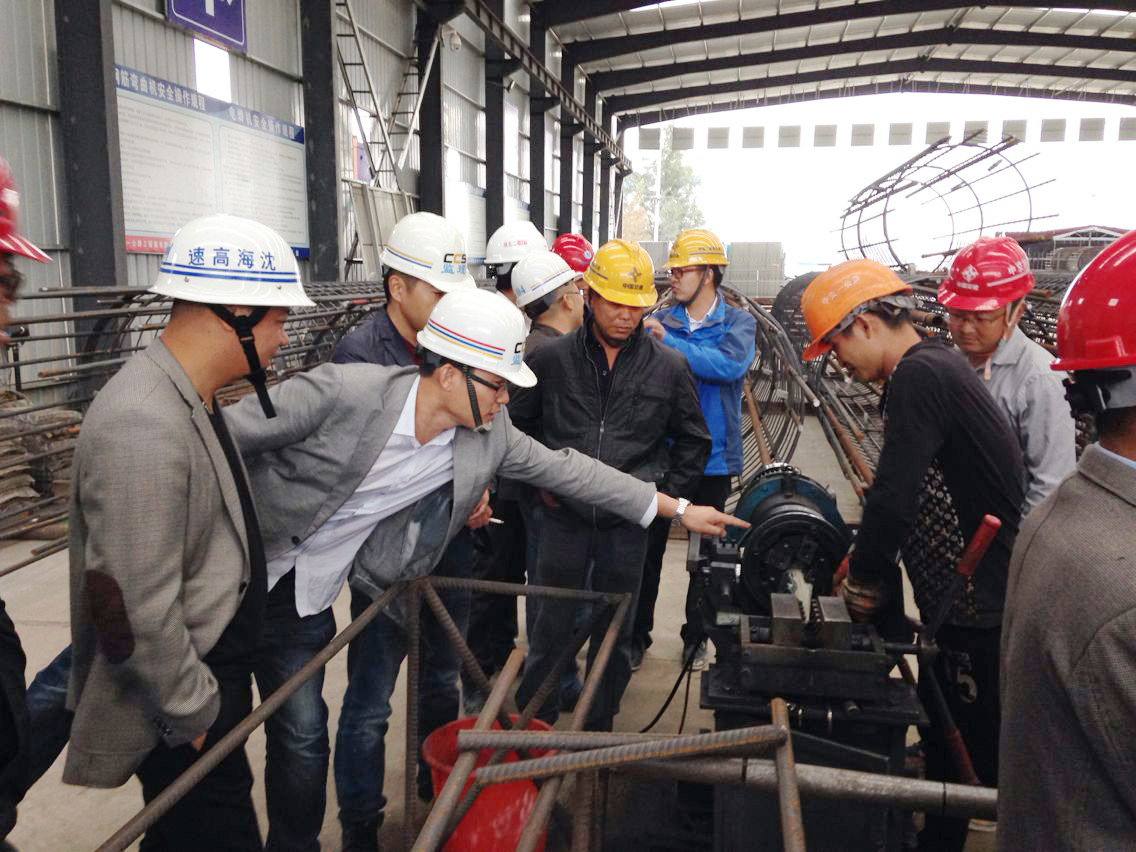 钢筋直螺纹套筒连接是绕北二期钢筋工程的主要连接方式,绕北处高度重视钢筋直螺纹连接质量,其中5标在钢筋施工中质量突出。为提高全线钢筋工程质量,绕北处特组织监理办、施工标段技术管理人员和钢筋操作人员到5标钢筋加工场进行现场交流学习。在交流会现场,5标施工负责人和钢筋车丝操作工人对直螺纹车丝步骤、质量控制与检查等进行了详细的介绍,并现场演示了操作过程,各单位施工技术人员对施工中存在的问题进行了充分交流。