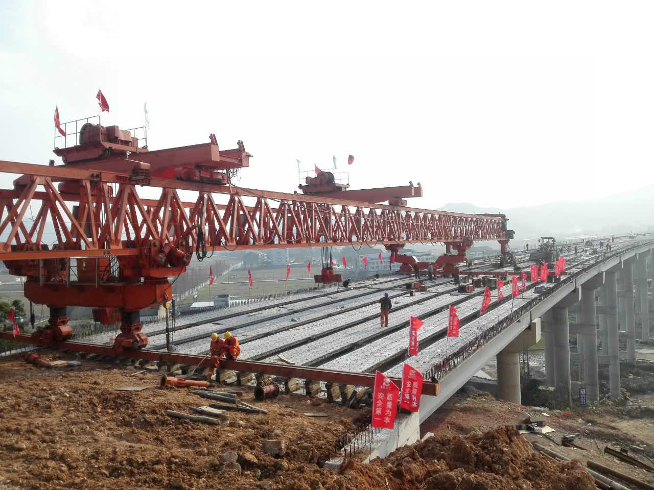 5标共有大桥3座,其中桐溪2#大桥跨径最长,施工难度最大。项目部本着“优质、安全、高效”的宗旨,历时5个月,在2017年元旦前完成了桐溪2#大桥64孔共计448片的预制T梁架设任务。该桥上穿一条施工便道、两条乡间公路及两条乡间小道,施工难度较大。项目部及作业组加大人力物力投入,在每个通道下设门洞,并在派遣专职安全员看守,保证梁板架设工作顺利完成。此外,5标将于