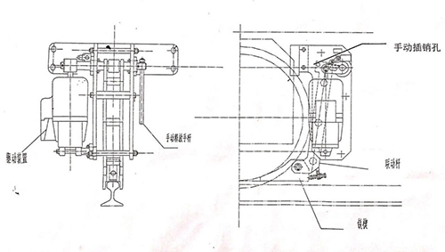 除电器控制自动制动外,该制动器还兼有手动制动的部件,在电器控制失效的情况下,可采取手动制动的方式实现,无疑是轨道制动的双保险,相比常规夹轨器,不仅安装方便,操作简洁,也大大提高了安全系数。