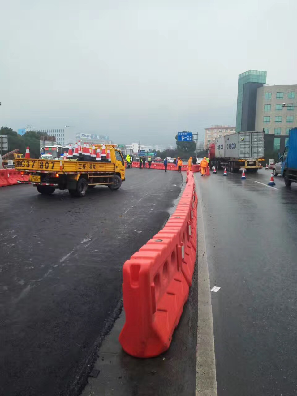 由于该加固方式对材料以及施工的环境有特殊要求,特别是在自密实砂浆初凝期间,桥面的车流量将会影响整体加固方式的效果。施工期间,温州大桥下方104国道永嘉方向车道仅供小车通行(限高1.8m,限宽2m),大车借对向乐清车道通行。福州方向第14跨梁板已处于施工准备阶段,预计4月初大桥桥面交通夜间自密实砂浆初凝期间进行封道施工。