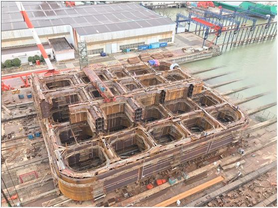 本项目中塔钢沉井在江苏韩通船厂进行加工制造,为满足5月11日低节27.5m钢沉井下水的工期要求,瓯江口大桥公司、施工单位与船厂多措并举。一是结合船厂生产、吊装能力细化设计图纸,在保证整体拼装的精度及加工的尺寸控制的基础上,将原先吊装36次完成节段整体拼接的设计方案改为吊装20次,并进一步优化为18次。二是在生产过程中举全厂之力,投入近700名专业技术人员加入中塔钢沉井的制造,大大保证了工期。