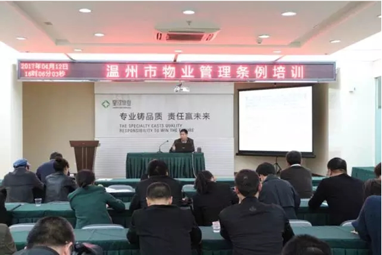 4月12日下午,星河物业公司在总部大会议室对即将实施的《温州市物业管理条例》开展专题培训,公司全体中、高层管理人员及各服务中心管理骨干参加了本次培训。