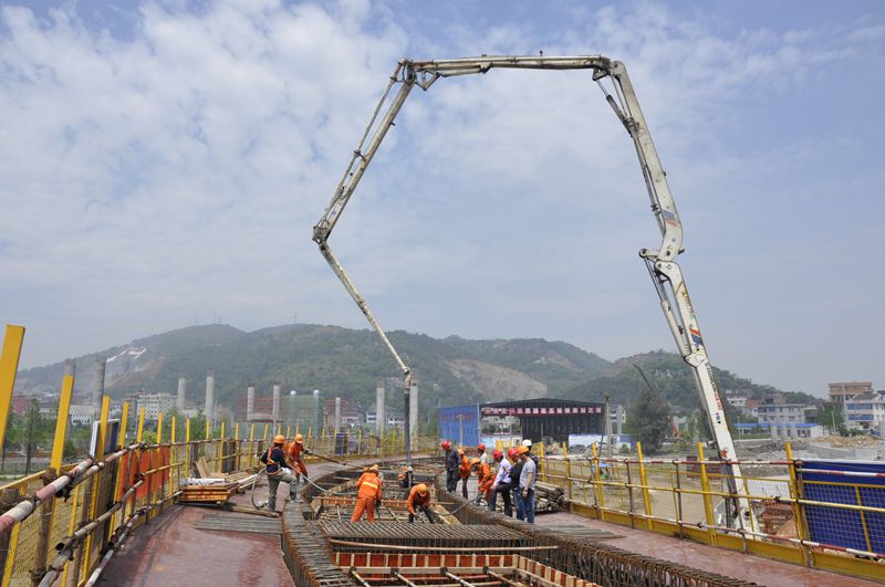 首件现浇箱梁为黄华枢纽互通G匝道桥第五联现浇箱梁,全长60米,由20m+20m+20m三跨组成,顶宽8.25米,底宽4.75米,梁高1.4米,单箱单室结构。此次混凝土浇注分两次浇注,第一次浇注底板、腹板,等混凝土强度达到一定强度后拆除内侧模板,安装顶板模板及绑扎顶面钢筋,然后再进行第二次浇注,共计浇筑混凝土310.4方。施工过程中,项目领导紧盯现场,严把原材料质量关、施工工艺关、设备调试检测关,督促现场做到安全、文明、规范施工。
