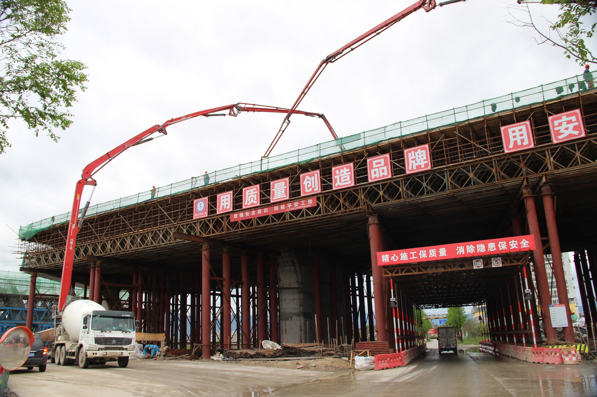 小港高架桥东河路支架现浇梁,采用钢管立柱加贝雷支架法施工,结构形式为(30+40+30)m的截面连续箱梁,箱梁设计采用单箱五室斜腹板截面,全长100米,共浇筑混凝土2843.1方,使用钢筋447.03吨,钢绞线183.16吨。由于连续箱梁跨越东河路,来往车辆繁多,安全风险极高。为了确保首联现浇梁施工顺利进行,项目部精心组织,周密部署,并在施工前多次召开现浇梁施工技术安全交底会,对施工方案进行多次研讨优化。浇筑前从钢筋绑扎、模板安装、混凝土原材料检验质量控制及配合比优化、机械设备和人员配置等做了充分的准备工作,混凝土浇筑时试验人员在拌和站和施工现场全程跟踪检测控制砼的坍落度等工作性能指标,技术人员严控砼振捣质量,防止出现漏振、过振现象,为首联现浇梁的顺利浇筑提供了充分保障。
