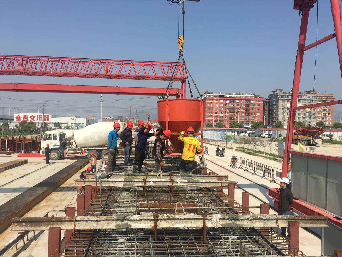 本次浇筑的首片箱梁为七里港互通主线第14孔2号梁,净长29.6米,梁面宽2.4米,浇筑混凝土33.1立方米。项目部预制梁场占地20亩,配备65吨和5吨门式起重机各2台,共设23个制梁台座,5列存梁区,按双层存梁方式存梁,一次可存梁72片。项目部主要承担299片简支箱梁制、运任务,其中30米箱梁254片,25米箱梁45片,预计于2017年底制梁结束。