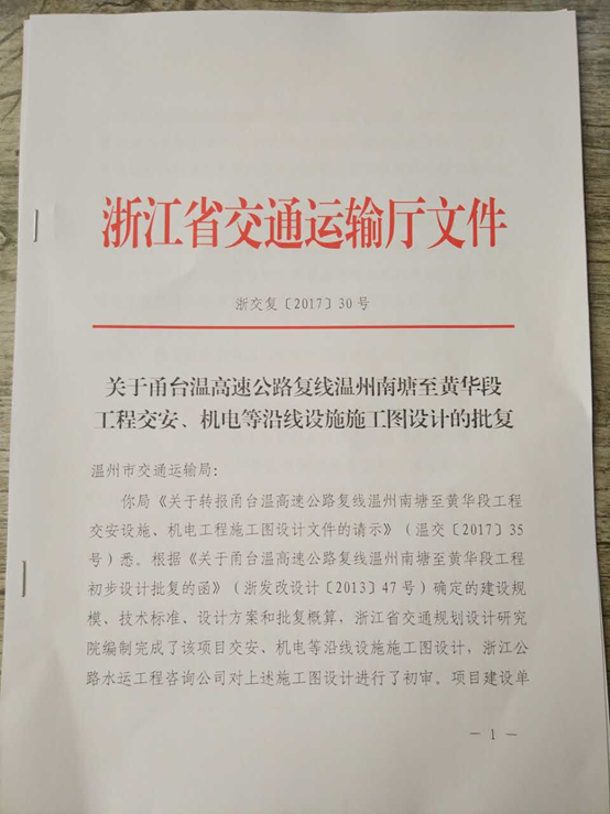 甬台温高速公路南塘黄华段项目交安、机电施工图设计获省交通厅批复