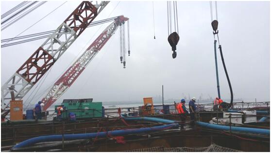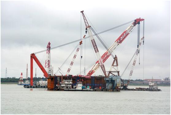 6月21日上午7时许,温州瓯江北口大桥重约万吨的中塔钢沉井顺利完成定位着床。