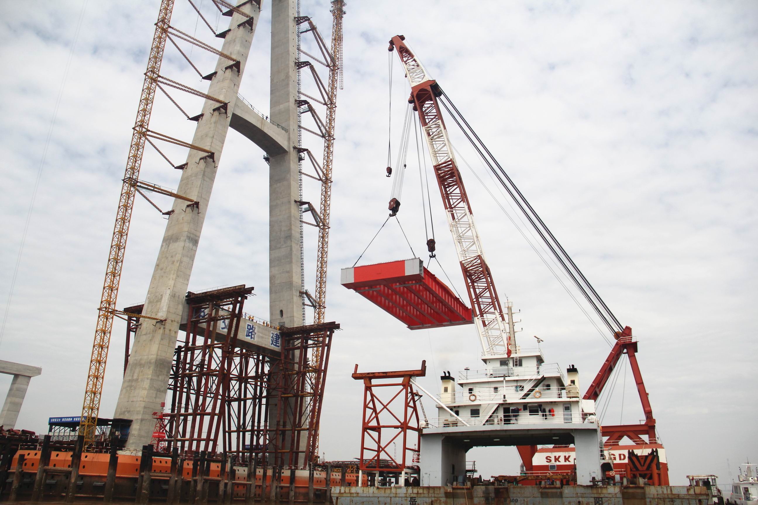 飞云江跨海特大桥首榀钢梁成功吊装