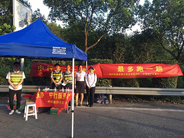 活动中,运营公司志愿者们不惧酷暑,在收费外广场设立了便民服务点,耐心地为司乘人员解答高速公路政策及夏日高温天气防疲劳驾驶知识的提问,并送上高速地图、清凉油、矿泉水等便民物品。中国银行永嘉支行志愿者则在现场办理高速ETC业务,让途径站点的司乘人员享受到在高温天气下少跑一趟的福利。