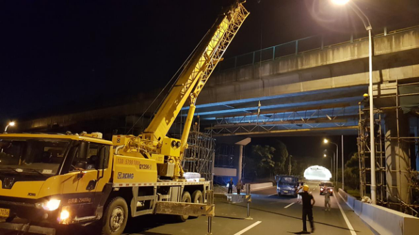 G15沈海高速公路温州大桥段跨金温铁路桥病害处治工程在预应力碳纤维板张拉施工时需要整桥跨通长的施工平台,而工程范围内位于瓯海大道主道(市区方向)上方的第八跨不具备搭设满堂脚手架的条件。经过多方考虑与深入研究后,运营公司决定在瓯海大道主道两侧绿化带搭设脚手架并在脚手架上架设工字钢施工平台。为确保施工与车辆行驶安全,施工平台吊装及搭接施工时需对该路段进行临时交通管制。瓯海大道作为我市东西向城市主干道,承担着重要的交通运输职责。为将市民出行影响降到最低点,运营公司23日凌晨零点进行封道,整个封道、施工过程紧凑有序,于凌晨四点顺利完成平台搭设的全部任务并按照既定计划解除交通管制。