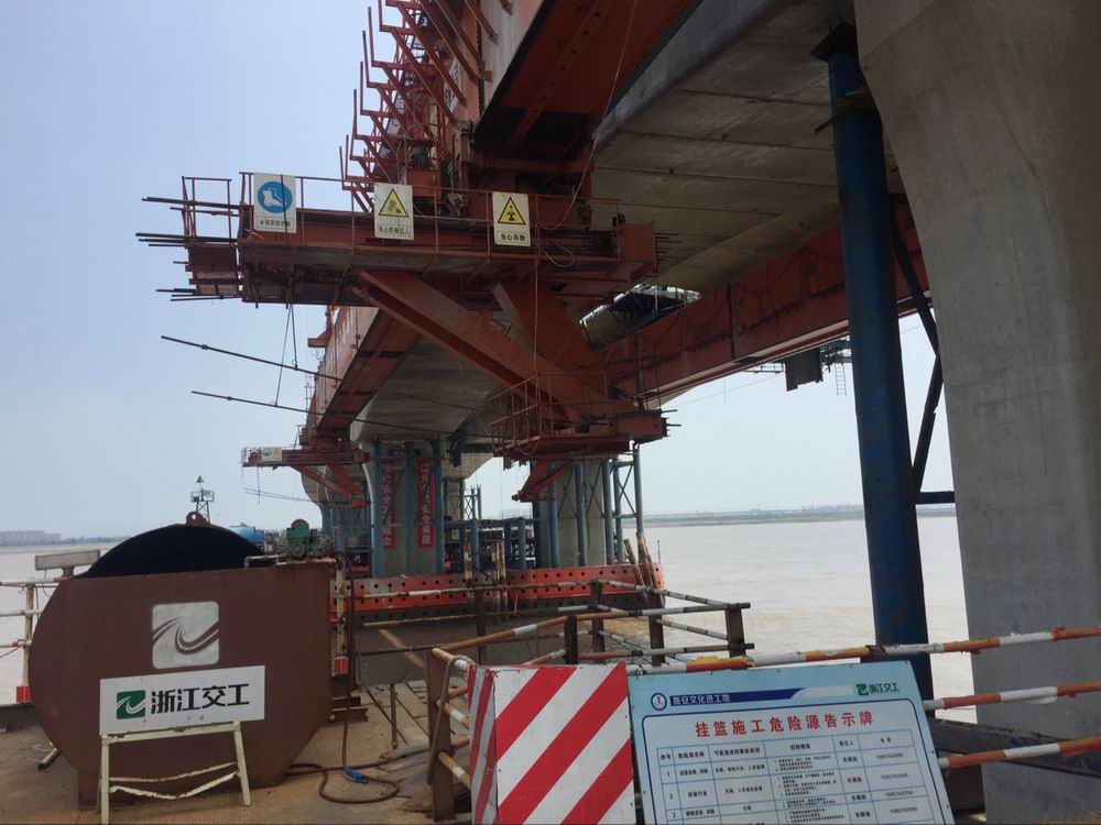 为保证移动模架顺利通过,沈海公司要求该项目部组织技术人员对方案进行认真评估,预先确认每一个操作细节和保障措施,并对移动模架进行全面检查加固,确保移动模架的结构稳定性,同时中止大桥左幅挂篮施工。对影响过孔的塔吊、钢管、挂篮翼缘板予以拆除,减少外物可能对模架移动造成的影响,以确保移动模架顺利通过通航孔。