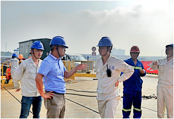 直到17:30,第一根主梁的安装才顺利完成。如果主体结构没有一次性安装完成,其巨大的不稳定性将成为南塔钻孔平台上最大的安全隐患。因此,施工单位所有作业人员当机立断调整安装节奏,加快安装效率,加班加点,确保所有的主体安装工作在12个小时之内完成。最终在19:00前完成了第二根主梁的安装,龙门吊的主体安装工作全面完成。