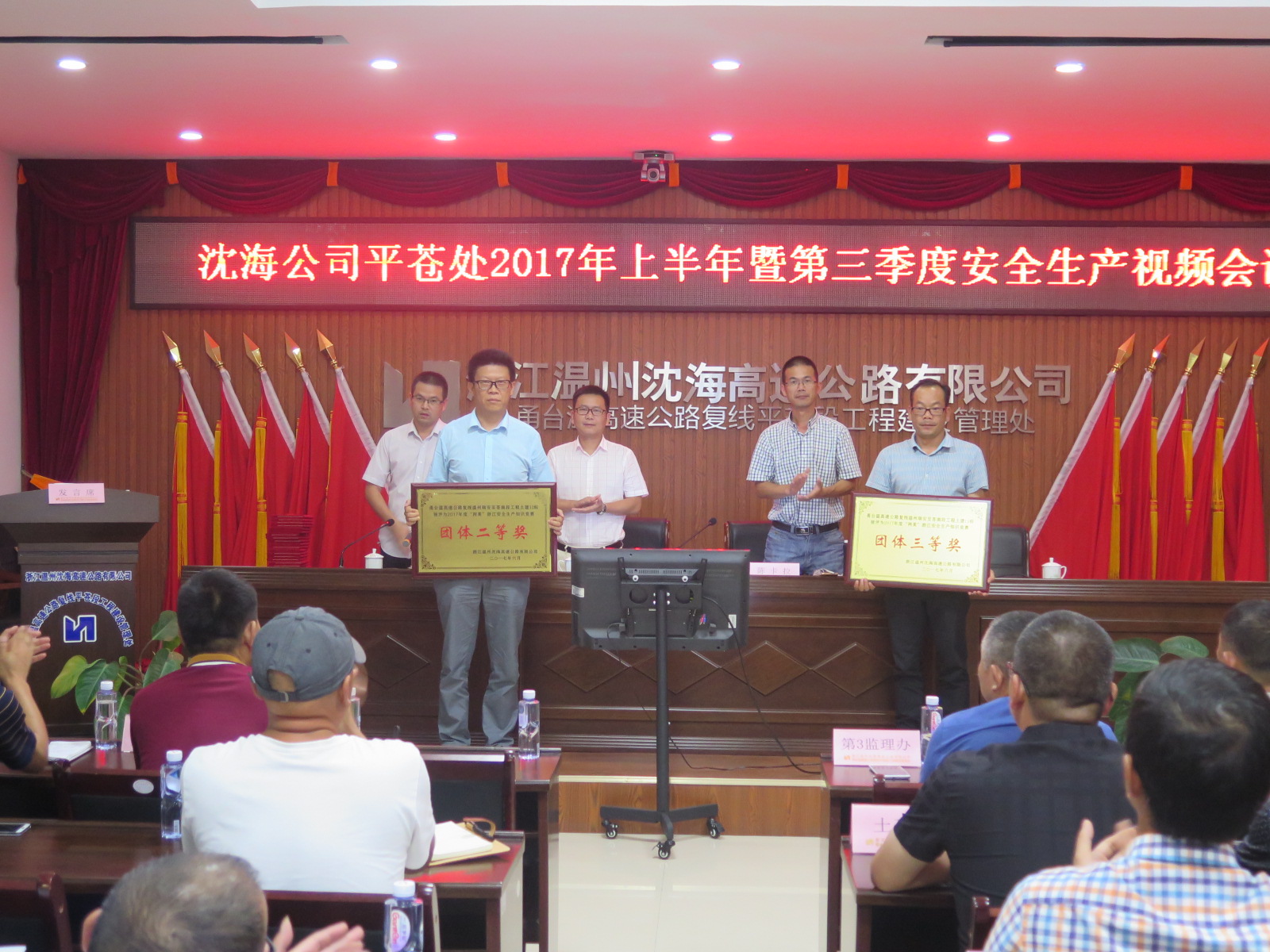 本次会议采用视频会议形式,由一个主会场,17个分会场组成。会议首先宣贯了交通运输部最新修订的《公路水运工程安全生产监督管理办法》以及交投集团、沈海公司关于下半年安全生产工作部署和“两美”浙江建设相关文件精神,并对近期平苍段工程全线安全生产形势进行了通报反馈。之后,平苍处副处长陈卡拉作2017年上半年安全生产工作报告,对下半年安全生产工作重点任务进行了详细部署。最后,平苍处处长助理胡孙敏宣读了“两美”浙江安全生产知识竞赛获奖名单,并举行了颁奖仪式。