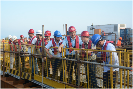 8月17日下午,浙江省交通建设工程监督管理局安全处副处长廖乾旭一行,在温州瓯江口大桥有限公司总经理郑锋利等陪同下,检查瓯江北口大桥工程建设安全生产。