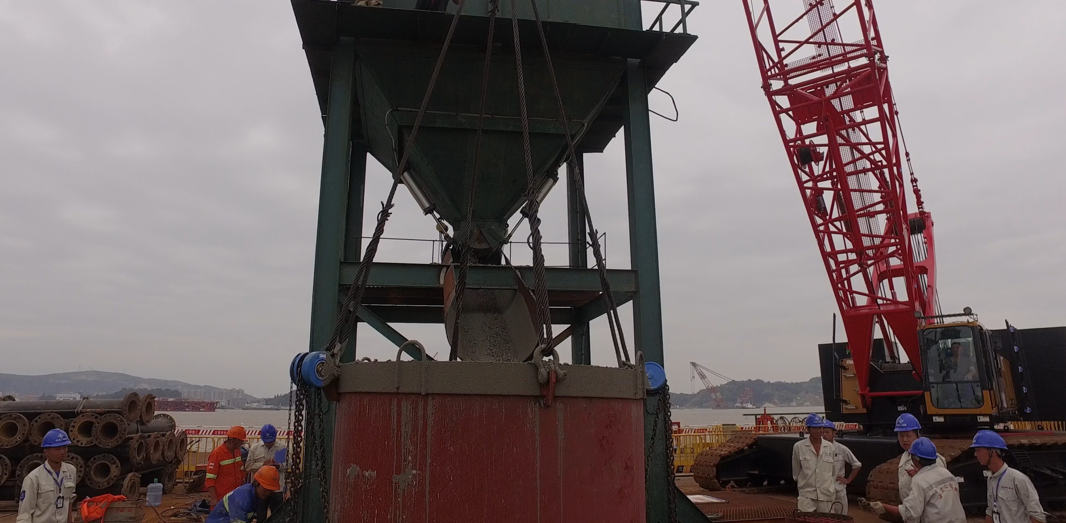 10月8日23时55分,南塔首根桩顺利浇筑完成!南塔选取12#桩基为首件工程,桩长125.7m,为3.3—3.0m的变径桩,混凝土标号为C35海工,单根桩方量982.3立方米。南塔桩基灌注采用24立方米的中心集料斗配合4立方米的中料斗“拔塞法”进行封底,砼罐车直接灌注的方式进行连续浇注。为满足现场施工需求,项目部后场生产区设置2台180m3/h砼搅拌站生产混凝土,以确保混凝土连续供应。