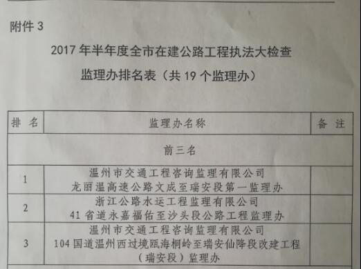 本项目劳动立功竞赛有两个监理办、六个施工单位参赛。劳动立功竞赛领导小组通过监理工作中的安全管理、质量管理、合同管理、信息化管理、监理内部管理、资料建设等对两个监理办进行综合评定。龙丽温文瑞第一监理办又一次以总分第一的好成绩完美胜出,勇摘第一桂冠。这是2017年龙丽温文瑞第一监理办在温州市上半年执法大检查荣获全市第一名之后,向公司、向业主递交的一份优秀的答卷。