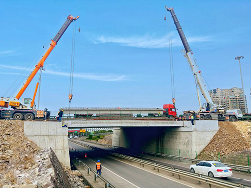 蒲岐互通位于温州市乐清蒲岐镇西北侧,蒲岐互通现状为A单喇叭状,匝道下穿主线,互通匝道出蒲岐收费站后与连接虹南线和万泽的地方道路呈T形平交。整个蒲岐互通区域由福建方向下行D匝道、福建方向上行E匝道、台州方向下行C匝道以及台州方向上行A、B匝道共5个匝道组成。蒲岐互通交通通行复杂,车流量巨大,跨A匝道架梁吊装作业充满了巨大的挑战。高投公司项目部精心组织,合理规划,在不影响高速公路正常通车的情况下,采取二类封道,利用1月23号以及1月24号两个上午的时间,顺利完成蒲岐互通跨A匝道桥左右幅共12片空心板的架设。