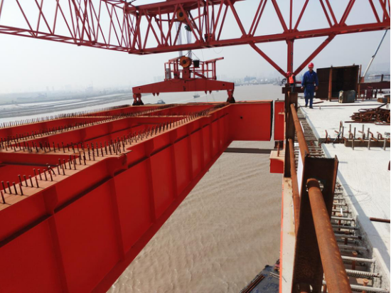 3月9日,北岸首片桥面吊机吊装钢主梁顺利就位,南岸首片钢主梁已于2018年3月7日先行完成。钢主梁顺利悬臂吊装,距离鳌江六桥合拢又迈进一步。鳌江特大桥全长2083.02m,主桥为双塔双索面叠合梁斜拉桥,主桥跨径52+88+320+88+52。此钢箱梁共计57个节段,总重量9115.5吨。钢箱梁安装根据不同部位需要分“浮吊船吊装配合支架临时支撑、桥面吊机悬臂吊装”两种型式。浮吊船吊装部分共26节已于2017年底完成,目前进入悬臂吊机安装阶段(共31节采用桥面吊机安装)。