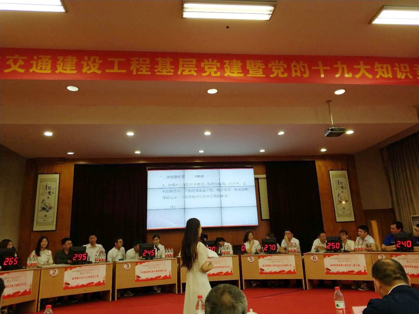 本次竞赛由温州市交通局和温州市交通工程质监局主办,共分为初赛和决赛,内容涉及党史、党章、党内监督条例、廉洁自律准则、纪律处分条例、系列讲话、基层党建实务、党的十九大报告等。瓯江北口大桥队伍在赛前认真筹备,利用业余时间多次自发组织集中学习、互相探讨,比赛过程中精诚团结,充分发扬团队合作精神,最终获得三等奖。
