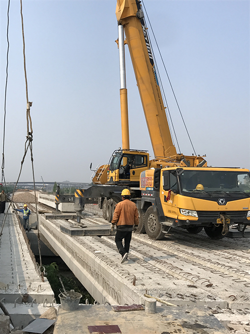 汇底二桥中心桩号K22+635,全长41.1米,按左右分幅设计,共1联2跨空心板,先简支后连续结构,单孔9片梁板。小桩号侧241米为汇底一桥,大桩号侧254米为珠南分离桥。因位置靠近居民区,施工过程中一直存在缺少施工便道等诸多问题。项目部在施工前精心组织技术力量,多方面考虑可能出现的问题,严格进行技术、安全交底。项目精心组织部署,顺利完成了全桥的梁板吊装施工。