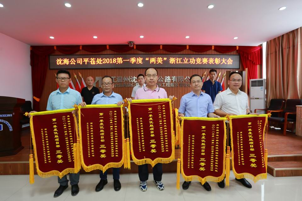 为树立典型,表彰先进,进一步激发“两美”创建热情,凝聚全盘之力,助推工程又好又快建设,5月22日下午 ,沈海公司平苍处组织召开2018年第一季度“两美”浙江重点工程立功竞赛表彰大会。沈海公司蔡邦国、陈智寿,管理处各职能科室及施工、监理单位共计100余人参加会议。