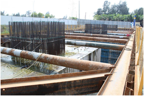温州瓯江北口大桥土建三标项目南引桥线路长度为2603米,承台142个,分合并段和分离段,其中合并段长度为1050米,分离段长度为1553米。合并段承台为58个,分离段承台为84个。本次浇筑的S10墩承台由三件方形承台组成, 分别为一个13米×13米×4米的中承台,两个13米×8米×4米的边承台,使用强度为C30的混凝土,三个承台钢筋总量为150吨,混凝土总量为1513方。S10墩承台属于陆上承台,承台地表部为冲海积粉质黏土,流塑状。承台开挖深度范围为黏土和淤泥质黏土。混凝土浇筑期间,由专人检查预埋钢筋和其它预埋件的稳固情况,对松动、变形、移位等情况,及时将其复位并固定好。