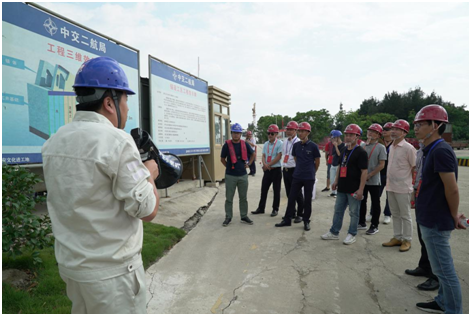在项目施工现场,戴显强一行实地查看了南塔、南锚碇和北口大桥展览馆,了解工程施工进度及项目标准化情况,并就现阶段党建工作问题与工作人员进行了交流。